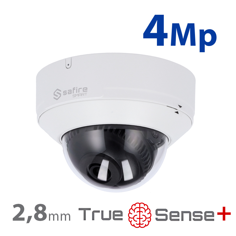 Dome IP SAFIRE SMART 4 Mp, Ottica 2.8 mm. Microfono integrato, 1 Ingresso audio. Allarmi: 1 Ingresso / 1 Relay. IR 30m. Scheda microSD fino a 256GB. TrueSense+: Classificazione di persone, veicoli e veicoli non motorizzati. Rilevamento del volto e acquisizione del volto. Conteggio di persone e veicoli. Identificazione persone e veicoli Waterproof IP67 & IK10. Alimentazione: DC 12 V / 460 mA / 5.5 W máx. / PoE IEEE802.3af. Dimensioni: 119 (Φ) x 87.80 (H) mm. Corpo in metallo. Compatibile con: SF-WALLBRACKET-0203 staffa da parete; SF-JBOX-0101B junction box.