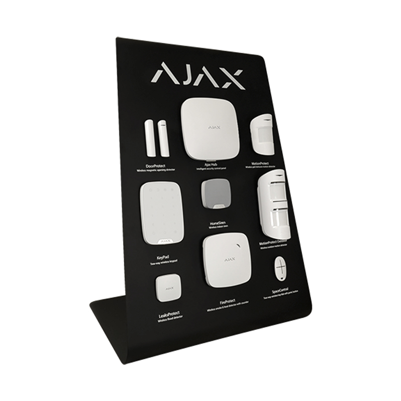 Espositore metallico da tavolo – Colore bianco. Resistente e di alta qualità – Include kit interamente funzionante – Contenuto: Hub-W (pannello con batteria di riserva), 1 rilevatore di movimento PIR MotionProtect-W, 1 contatto magnetico porta/finestra DoorProtect-W, 1 telecomando SpaceControl-W, 1 tastiera indipendente KeyPad-W, 1 sirena per interni HomeSiren-W, 1 rilevatore di inondazione LeaksProtect-W, 1 rilevatore di fumo FireProtect-W e 1 rilevatore per esterni MotionProtectOutdoor-W