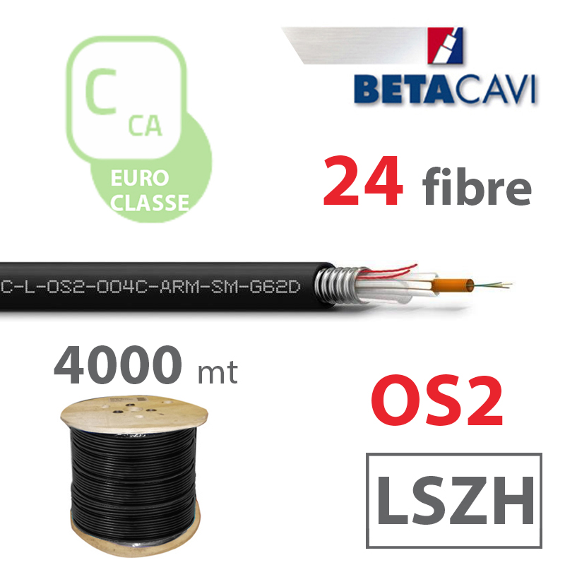 Fibra ottica monomodale Tipo Loose con armatura in acciaio INOX corrugato termosaldato, modello OS2, 24 fibre, guaina esterna in LSZH Duraflam® di colore nero, diametro esterno 8,7, per posa in interno, esterno, cavidotti protetti e luoghi pubblici, in Euroclasse Cca, s1b, d1, a1 in bobina da 4000m.