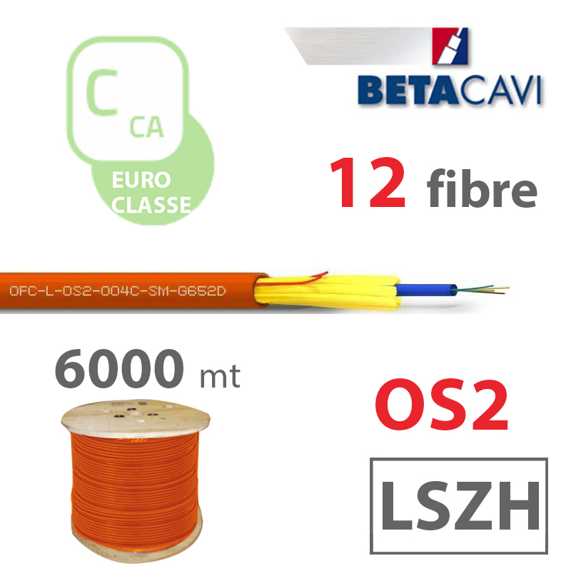 Fibra ottica monomodale Tipo Loose con armatura dielettrica, modello OS2, 12 fibre, guaina esterna in LSZH Duraflam® di colore arancio, diametro esterno 6,8, per posa in interno, esterno, cavidotti protetti e luoghi pubblici, in Euroclasse Cca, s1b, d1, a1 in bobina da 6000m.