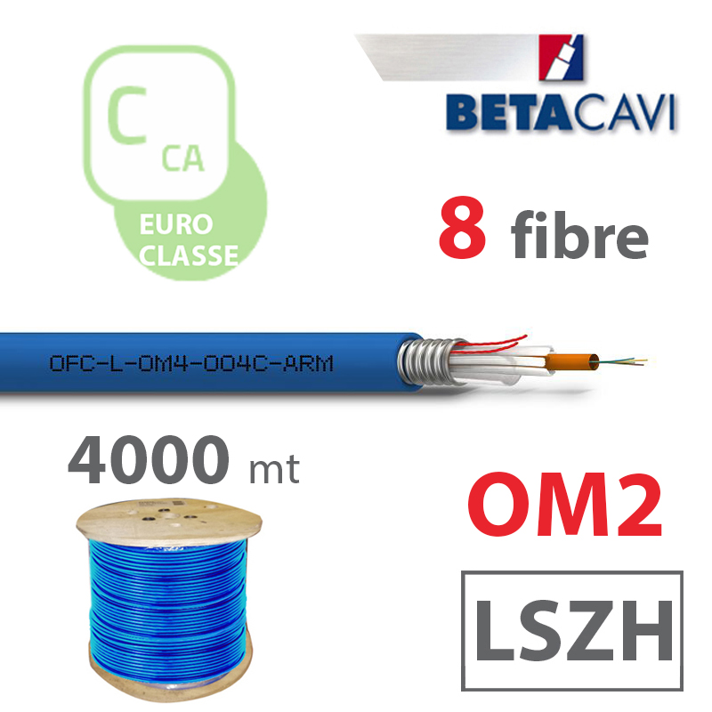 Fibra ottica multimodale Tipo Loose con armatura in acciaio INOX corrugato termosaldato, modello OM2, 8 fibre, guaina esterna in LSZH Duraflam® di colore blu, diametro esterno 8,7, per posa in interno, esterno, cavidotti protetti e luoghi pubblici, in Euroclasse Cca, s1b, d1, a1 in bobina da 4000m.