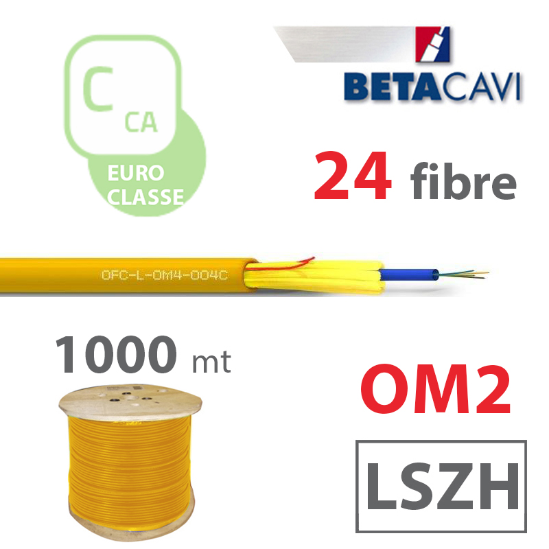 Fibra ottica multimodale Tipo Loose con armatura dielettrica, modello OM2, 24 fibre, guaina esterna in LSZH Duraflam® di colore giallo, diametro esterno 6,8, per posa in interno, esterno, cavidotti protetti e luoghi pubblici, in Euroclasse Cca, s1b, d1, a1 in bobina da 1000m.
