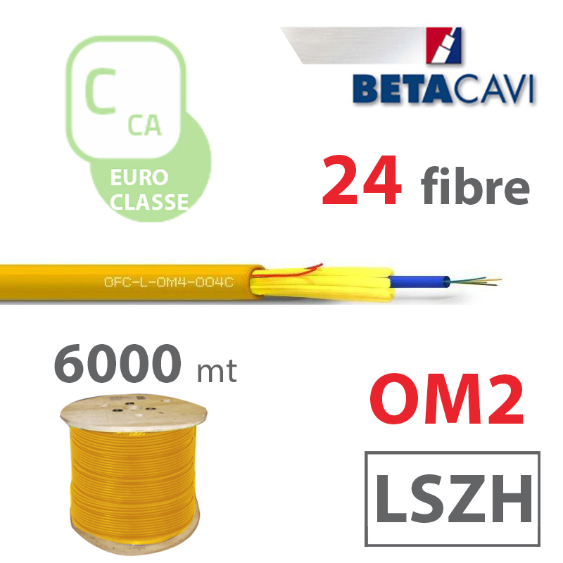 Fibra ottica multimodale Tipo Loose con armatura dielettrica, modello OM2, 24 fibre, guaina esterna in LSZH Duraflam® di colore giallo, diametro esterno 6,8, per posa in interno, esterno, cavidotti protetti e luoghi pubblici, in Euroclasse Cca, s1b, d1, a1 in bobina da 6000m.