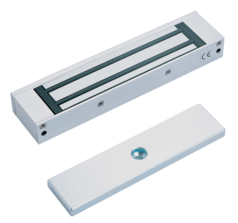 Fermo elettromagnetico in alluminio anodizzato. Forza di tenuta 180Kg. Adatto alla chiusura di porte di piccole dimensioni o serramenti di passaggio non ad alta sicurezza. Reed per segnalazione stato porta. Connessione a morsetti. Montaggio a vista. Dimensioni LxHxP 166x39x21mm. Temperatura di lavoro -20…+60°C. Alimentazione 12Vcc, 370mA o 24Vcc, 185mA.