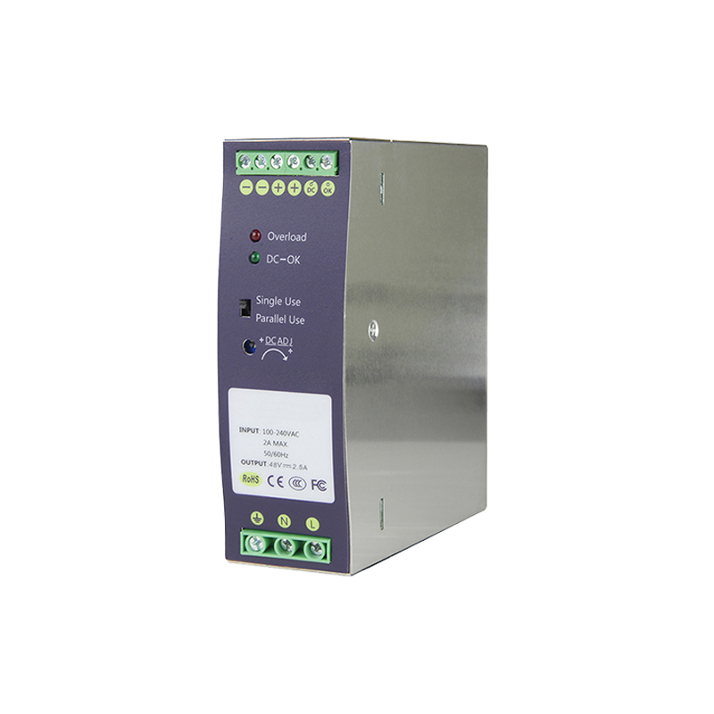 Fonte di alimentazione commutata, uscita DC 48 V 2.5 A / 120 W 2 uscite. Voltaggio in entrata 90 V ~ 264 V, 134 (P) x 124 (H) x 41 (L) mm. Montaggio su guida DIN.