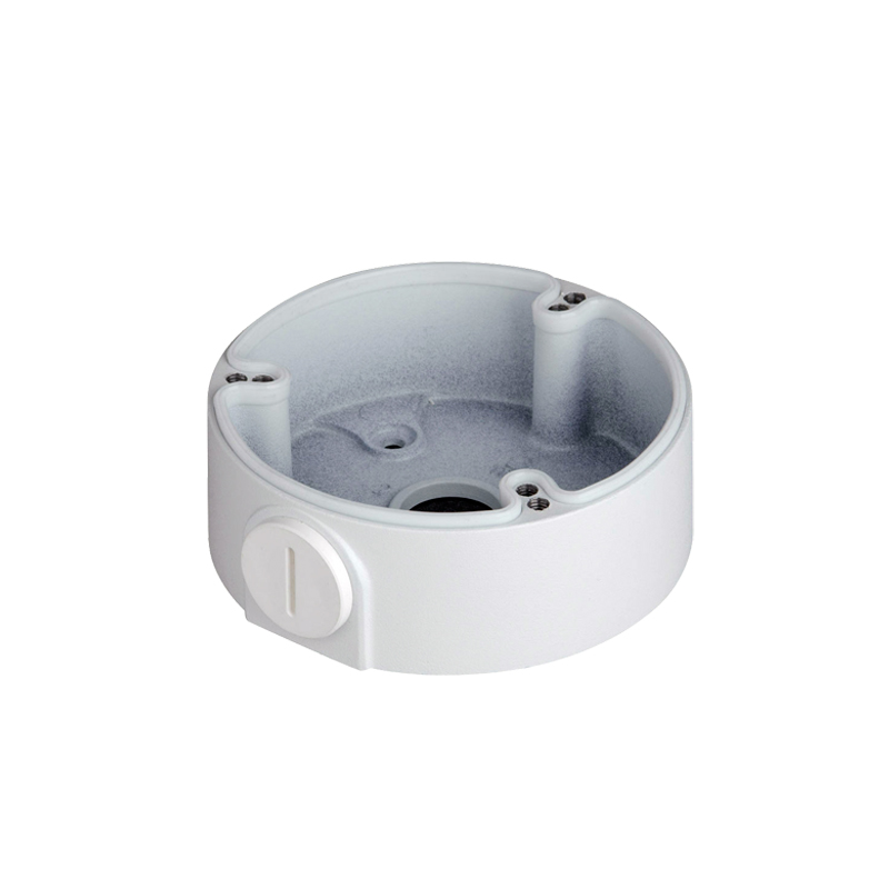 Junction box per telecamere bullet, adatto per esterni, installazione a tetto o parete, dimensioni: 32 (H) x 90 (Ø) mm, corpo in lega di alluminio, colore bianco. La confezione contiene 3 pin e 3 viti per il montaggio, 3 viti per fissaggio della telecamera, Chiave Allen.