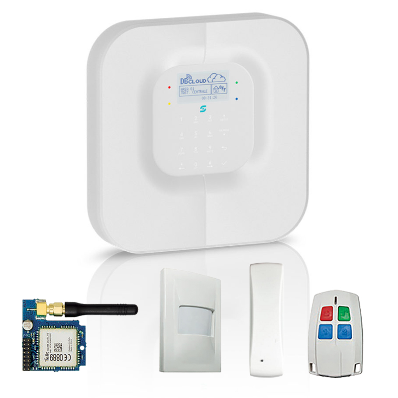 kit composto da CentraleDBCLOUD,n.1moduloGSM-CL,n.1radiocomadoDB722-CL,n.1sensoreDB712,n.1 sensore DB 710.