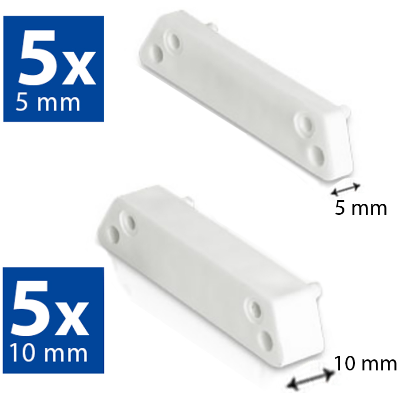 Kit distanziali magnete per trasmettitori radio BIANCO. 5x distanziali da 5mm, dimensioni LxHxP 52x11x5mm + 5x distanziali da 10mm, dimensioni LxHxP 52x11x10mm. Confezione 10pz.