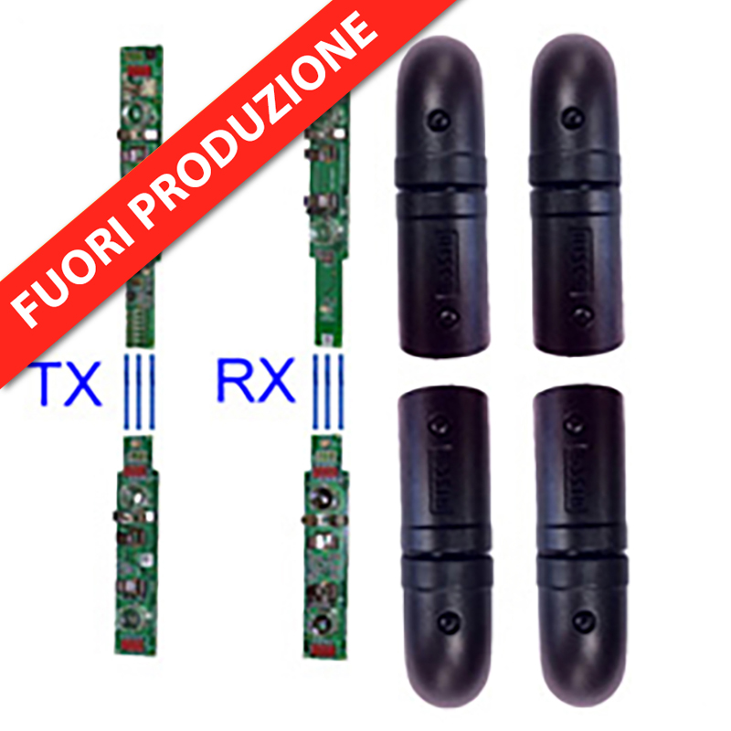 Barriera radio bidirezionale 868MHz ad infrarossi attivi per la protezione di perimetri e finestre in esterno. Portata fino a 5m in esterno e 8m in interno, immune a sole e nebbia, elevata immunità ai falsi allarmi, massimo 10 moduli per batteria, anticollisione tra due barriere per il montaggio su finestre adiacenti, PLUG & PLAY il sistema riconosce e apprende il numero di moduli IR e assegna un ID ad ogni modulo, TECNOLOGIA DIRECT SUNLIGHT elaborazione e analisi del segnale uniche nel loro genere per elevate prestazioni anche con luce solare diretta, TECNOLOGIA FOG FRIENDLY raggi IR ad alta intensità consentono il funzionamento anche in caso di nebbia, TECNOLOGIA GREEN CONSUMPTION progettazione intelligente che consente di ridurre i consumi, utilizza batteria al litio standard da 3V CR123A, tamper antiapertura e antirimozione.||Il Kit principale � comprensivo di:||- 1 modulo RC||- 1 modulo TC||- 1 modulo IR TX||- 1 modulo IR RX||- 4 supporti/snodi barriera||- 2 cavi piatti da 35cm + 2 cavi piatti da 65cm e relativi supporti di fissaggio||- 4 kit tamper||- 2 batterie al litio da 3V