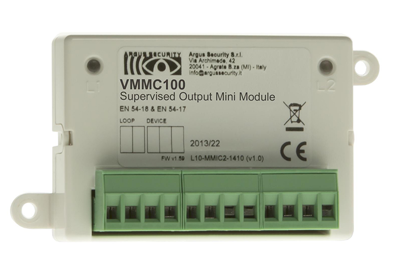 Mini modulo 1 OUT relé 30Vcc/ac 2A supervisionata. EN54-17, EN 54-18. Temperatura di lavoro -10…+55°C. Dimensioni LxHxP 75x52x18mm. Tensione loop 15…40Vcc, 200uA @24Vcc in standby, 6mA@24Vcc in allarme. (VMMC100)