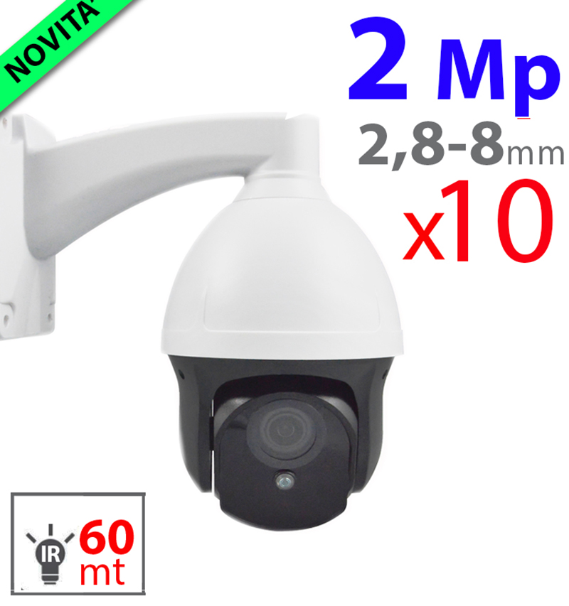 Speed dome IP PTZ. 1/2,8″ CMOS 2Mp. Main stream: 1920x1080p@25fps. Bitrate 32Kbps – 16Mbps, VBR/CBR. D/N meccanico. Ottica ZOOM 3X 2,8-8mm, 260° PAN, -5…+60° TILT. 0,5…12°/s. 3 LED IR 60m. Funzioni AWB, AGC, BLC, 3DNR, D-WDR. Compressione video H264. Protocollo TCP/IP, UDP, DHCP, NTP, RTSP, PPPoE, DDNS, SMTP, FTP. 255 preset, 8 gruppi. Slot per SD card, max 64GB. IP66. Staffa fissaggio a muro inclusa. Temperatura di lavoro -30°…+60°C. Dimensioni speed dome φxH 100x140mm, dimensioni staffa LxHxP 67x105x140mm. Peso 0,7Kg. Alimentazione 12Vcc, 2A.