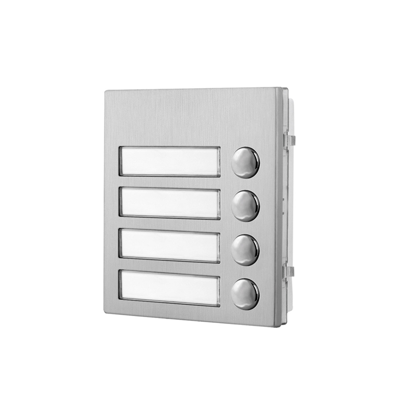 Modulo 4 pulsanti serie 4000 per sistemi VX2300 e IPure, antivandalico (IK07). 4 pulsanti. Placca antivandalica IK07 in acciaio inox satinato. Cartellino portanome, retroilluminazione blu, connettore IDC, dimensioni 1 modulo. Morsettiera collegamento pulsanti, connettore IDC 16 pin. Alimentazione 12 Vdc +/- 10%. Temperatura di lavoro -20 +60°C. Dimensioni: 103 x 120 mm (L x H).