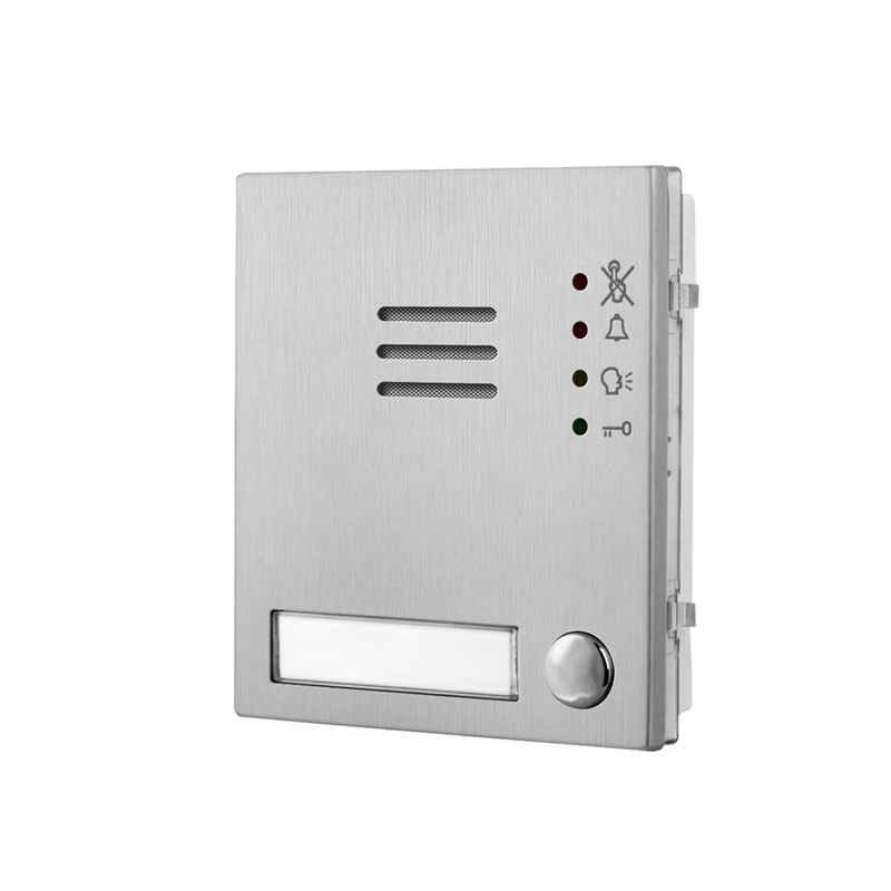 Modulo audio a 1 pulsante serie 4000 per sistema GSM. 1 pulsante incorporato, 50 pulsanti max. 4 numeri telefonici per pulsante. Placca antivandalica IK07 in acciaio inox satinato. Cartellino portanome con retroilluminazione blu. LED segnalazioni visuali Busy, Ring, Speak, Door Open. Programmazioni SMS/USB. Interfacce RS-485, Micro-USB. Numeri Dial to open 1000. Lettore di chiavi di prossimità integrato fino a 1000 utenti. Frequenza RFID 125KHz. 4000 eventi. Alimentazione: 12Vdc. Dimensioni: 103 x 120 mm (L x H).