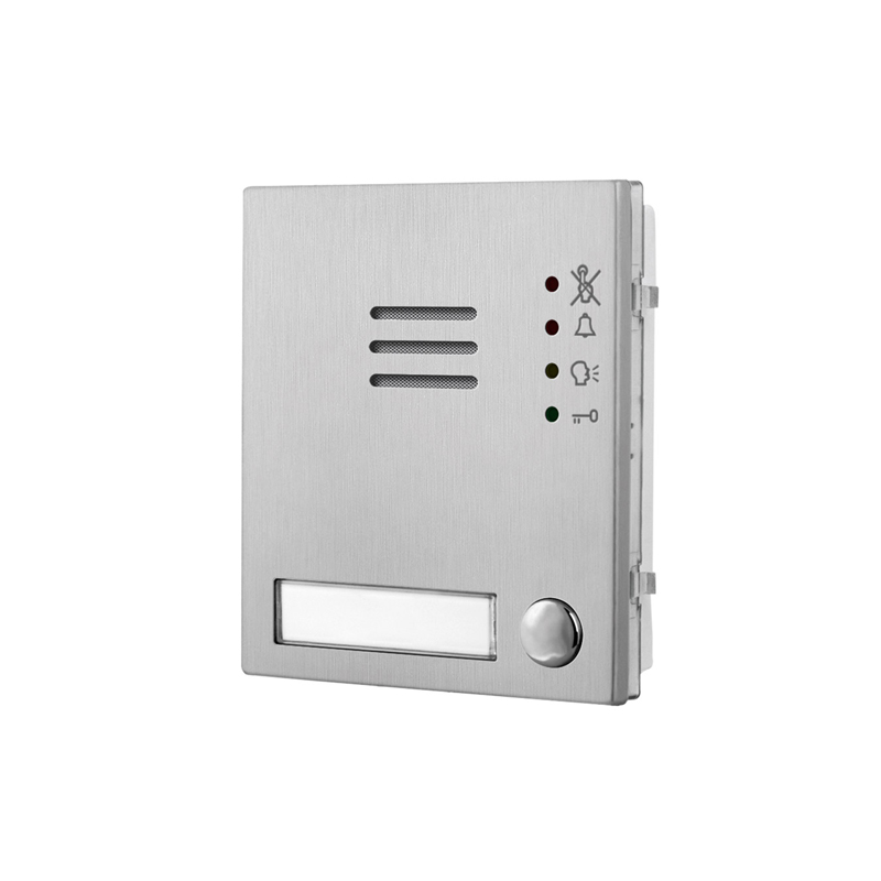 Modulo audio serie 4000 per sistema VX2300, antivandalico (IK07) in acciaio satinato, 1 pulsante, lettore di prossimità RFID integrato. Pulsanti incorporati 1, pulsanti Max 42. Placca standard in acciaio inox finitura satinata. Cartellino portanome. Retroilluminazione blu LED. Segnalazioni visuali, busy, ring, speak, door open. Lettore di prossimità integrato 125Khz H4102 60 chiavi (tramite master tag inclusa) 1000 chiavi (tramite programmazione da PC). Programmazioni: tempo apertura porta, tempo di conversazione, modo operativo, relè apertura porta (scarica capacitiva o contatti puliti). Modalità programmazione tramite dip-switch o PC. Interfacce RS-485/WIEGAND. Dimensioni 1 modulo. Regolazioni: microfono, altoparlante, bilanciamento, relè. 1. Contatti relè: contatti puliti / scarica capacitiva (12Vac/dc 1A max). Voltaggio relè max 24Vac/dc 2A. Connettore IDC, ingresso PTE. Alimentazione fornita dal BUS. Temperatura di lavoro -20 +60°C. Dimensioni: 103 x 120 mm (L x H).