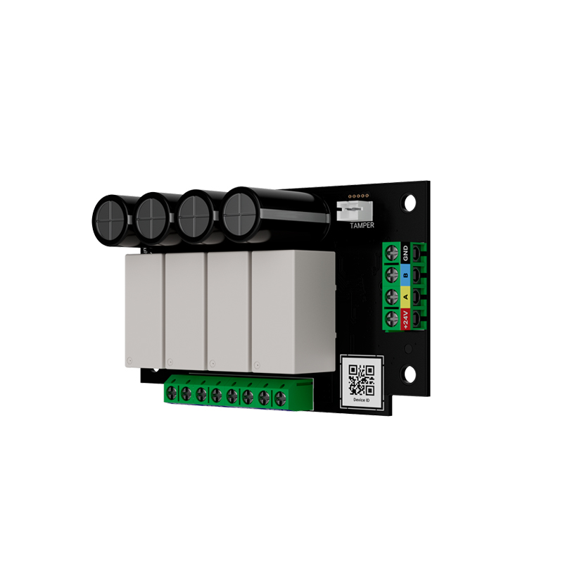 Modulo con 4 relè indipendenti protocollo Fibra. Certificato di grado 3. Stato del contatto: NC e NO, 2 modalità di funzionamento: pulsato e bistabile. Alimentazione: 24 VDC del bus Fibra. Dimensioni: 55 (H) x 90 (L) x 30 (P) mm.