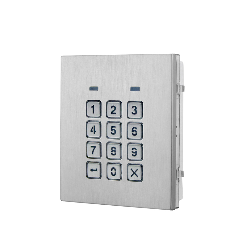 Modulo controllo accessi con tastiera numerica serie 4000 per sistema GSM, antivandalico (IK07) in acciaio satinato, 2 relè. Standalone/Network. Programmazione Tastiera/PC. Interfacce RS-485. Retroilluminazione tastiera blu, programmabile. Finiture placca, acciaio inox matte. Alimentazione: 12/24 Vac/dc. Dimensioni 103 x120 mm (L x H).