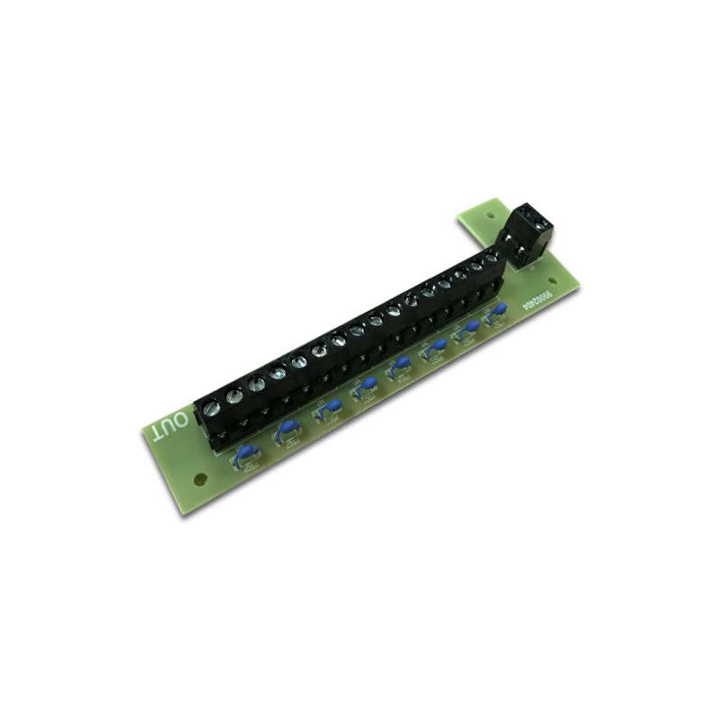 Modulo di distribuzione alimentazione con 8 uscite da 100 mA cad. a 12Vcc. È pensato per alimentare i sensori cablati connessi ad un concentratore serie RIVER installato in centrale. Le 8 uscite di alimentazione sono protette da PTC: l’alimentazione di ogni uscita viene interrotta se il suo assorbimento supera i 100 mA. È facilmente installabile direttamente sulla base di un concentratore RIVER.