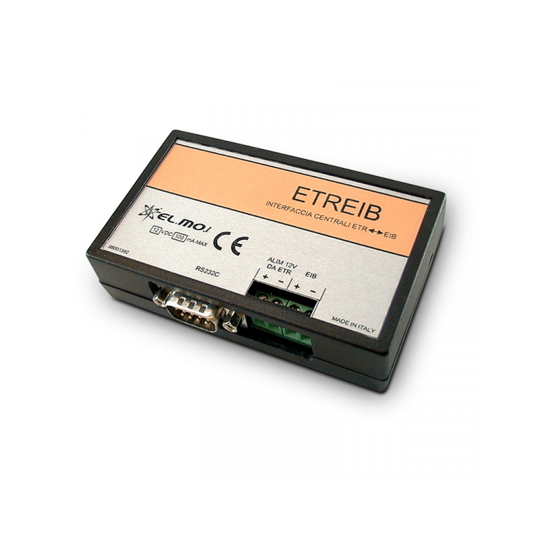 ETREIB è il modulo di interfaccia Konnex che consente la comunicazione dati tra le centrali EL.MO. compatibili e il sistema di automazione basato sullo standard EIB e viceversa.Incorpora una interfaccia fisica EIB standard che deve essere installata all’interno della centrale. È compatibile con le centrali serie ETR, ETR G2, VIDOMO, VIBASIC, NET832, NET9, PREGIO, TITANIA e VIDOMO2K. Dimensioni: L 101 x H 64,5 x P 26 mm, 80g. Assorbimento: 100mA max. Alimentazione: 12Vcc forniti dalla centrale (da 9,5 a 15V).