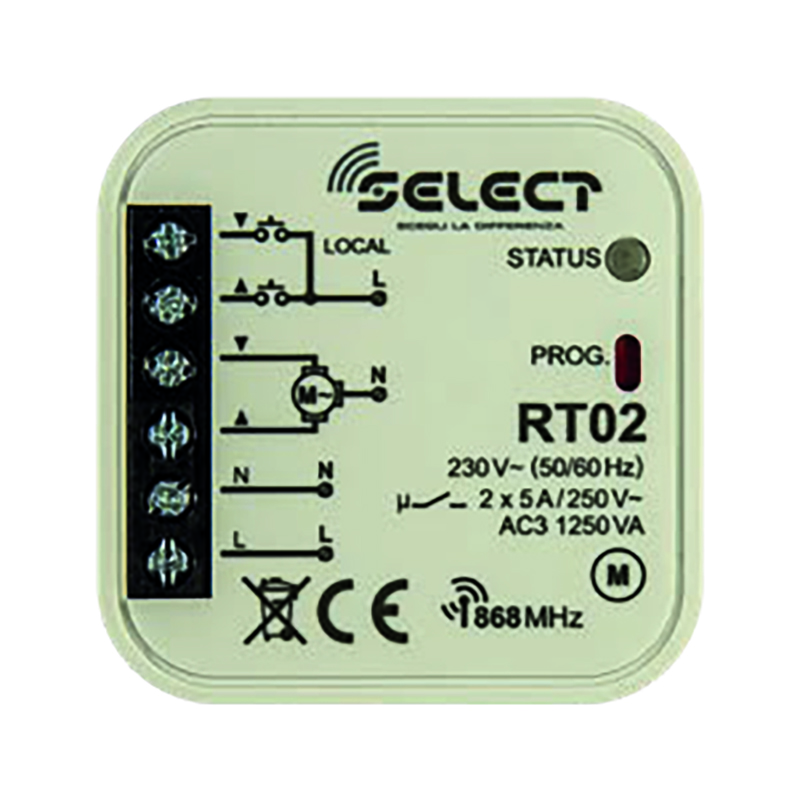 Modulo radio 868 MHz per azionamento di tapparelle, tende avvolgibili o dispositivi simili, dotati di motore elettrico 230 Vac con finecorsa. Può essere installato nelle scatole di derivazione, nella scatola portafrutti o nel cassonetto vicino al motore. Modalità di funzionamento, pulsante filare locale, comando radio locale, comando radio centralizzato. Uscite relè 250V, 5A per comando motore. Temperatura di lavoro -10…+55°C. IP20. Conforme alle norme EN60529, EN60950, EN6091000. Dimensioni LxHxP 47,5×47,5x20mm. Alimentazione 230Vac 50/60Hz 0,4W in stand-by.