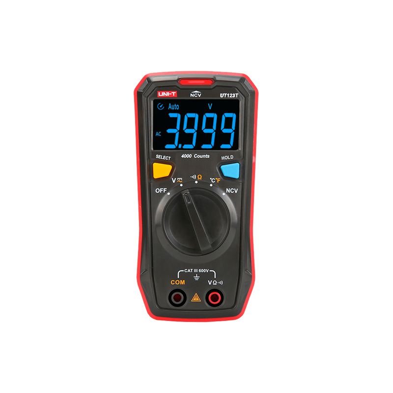 Multimetro digitale tascabile, display EBTN fino a 4000 conteggi. Misurazione della tensione DC e AC fino a 600V, alta precisione AC con funzione True RMS. Misurazione della resistenza e della temperatura. Cicalino per test di continuità: Funzione NCV (tensione senza contatto). Dimensioni display: 44mm x 26mm. Conteggi display: Fino a 4000. Alimentazione: 2 x pile (R6) 1.5V. Dimensioni: 130 (H) x 65 (L) x 28 (P) mm. Sicurezza CAT III 600V.