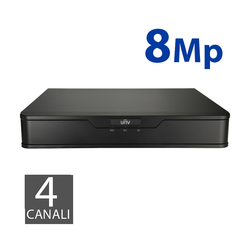 Registratore NVR per telecamere IP, gamma Easy. Video a 4 canali. Compressione Ultra 265, 4 canali PoE. Risoluzione massima 8 Mp. Supporta 1 disco rigido. Alimentazione: CC 48V. Alimentazione PoE: Switch PoE IEEE802.3at a 4 porte (max.54 W). Dimensioni: 46 (H) x 260 (L) x 240 (P) mm.