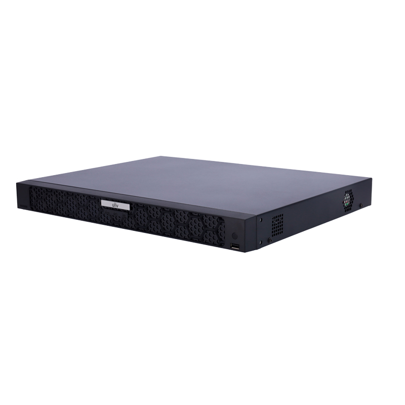 NVR Uniview Gamma Prime per videocamere IP, 32 CH video / Compressione Ultra H.265. Risoluzione massima 8Mpx. Larghezza di banda 320 Mbps. Ammette 4 hard disk. Alimentazione: 12 V CC/5 A ≤ 20 W (senza HD). Dimensioni / Peso: 440mm × 344mm × 48mm / 3,15 Kg.