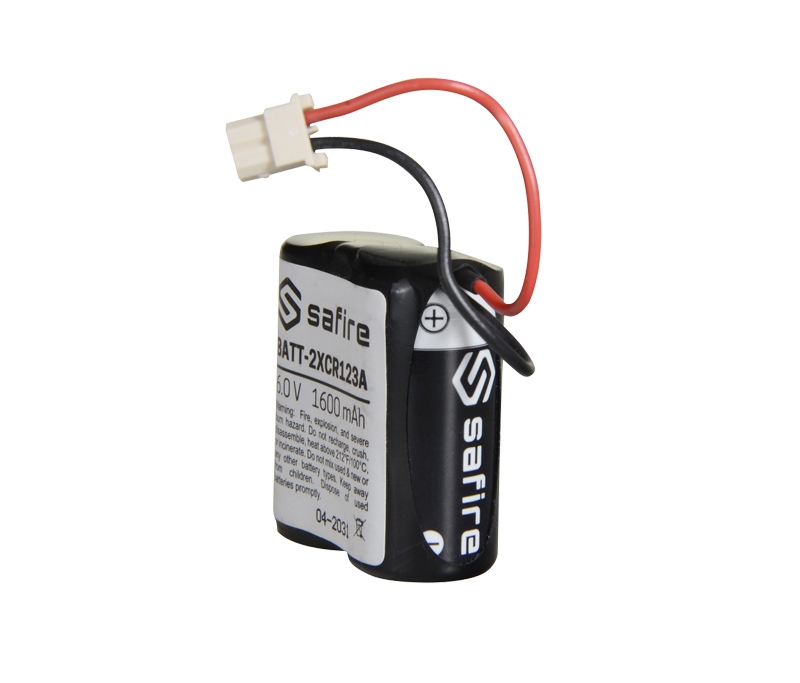 Pack di pile Safire CR123A / CR17345 / 5018LC. Connettore Molex 5284. Voltaggio 6 V / Litio. Capacità nominale 1600 mAh. Compatibile con rilevatori Visonic Next Cam PG2 e K9 PG2. Dimensioni: 34.5 mm (H) x 34 mm (L) x 17 (P) mm.