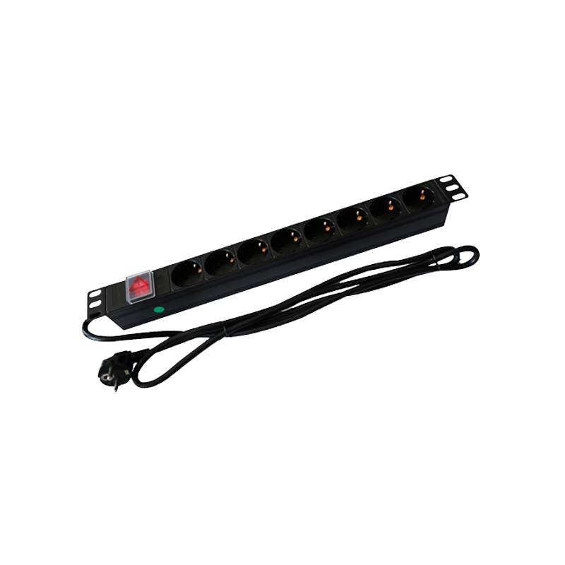 Multipresa di corrente (6 x SCHUKO) con magnetotermico 16A, per rack 1U. Pulsante di reset per sovraccarico. Colore nero.