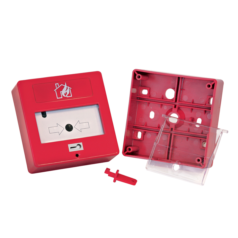Pulsante di allarme ripristinabile a chiave per impianti di rilevazione incendio. Corpo in materiale plastico di colore rosso. Certificazione EN54-11 CE 0051-CPD-0252. 1 Contatto di allarme in scambio e LED di memoria allarme. Morsetti di collegamento. Temperatura di lavoro -10…+50°C. Dimensioni LxHxP 90x90x28 mm.