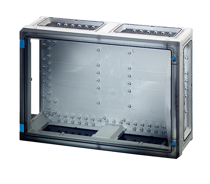 Quadro in policarbonato misura 4, SENZA pareti laterali, coperchio trasparente e viti di chiusuraa. Dimensioni esterne 540x360x163mm, dimensioni interne 486x306x140mm LxHxP