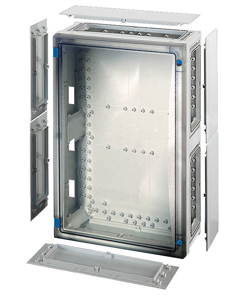 Quadro in policarbonato misura 4, IP66, completo di pareti laterali, coperchio trasparente e viti di chiusura. Dimensioni esterne 366x546x163mm, dimensioni interne 306x486x140mm LxHxP