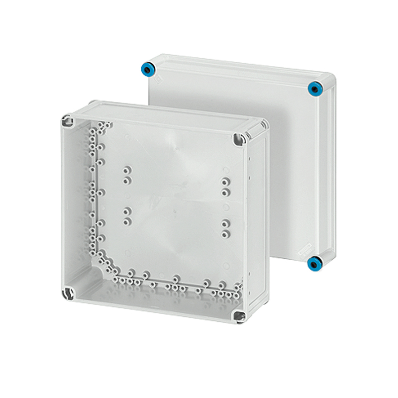 Quadro con pareti lisce in policarbonato misura 2 tipo Mi, IP66, coperchio opaco, apertura del coperchio tramite utensile piombabile, colore grigio. Dimensioni esterne 275x275x150mm