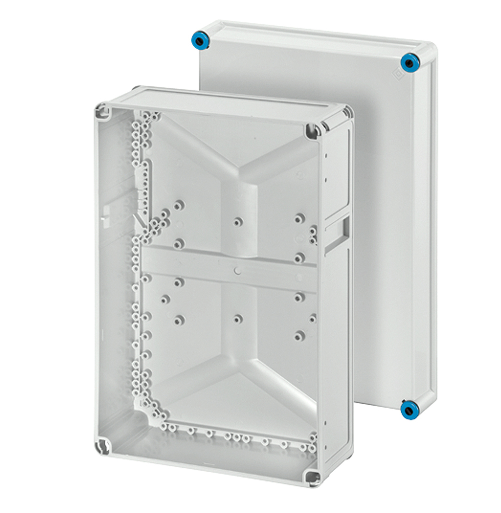 Quadro con pareti lisce in policarbonato misura 3 tipo Mi, IP66, coperchio opaco, apertura del coperchio tramite utensile piombabile, colore grigio. Dimensioni esterne 275x425x150mm