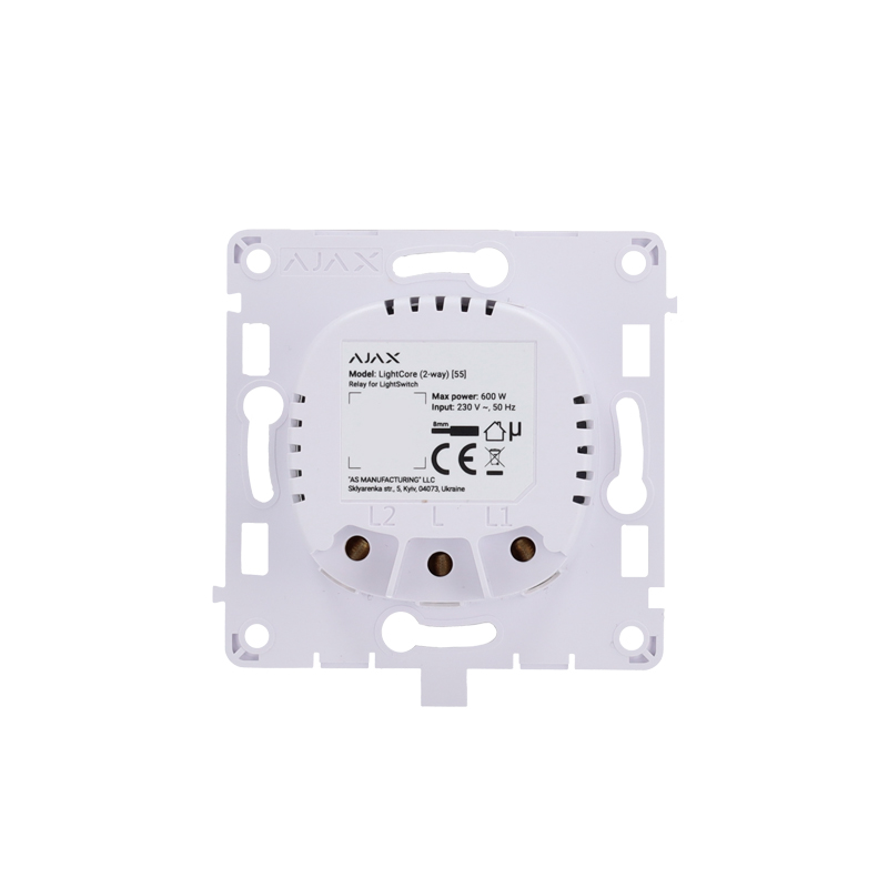 Relè per interruttore luce commutabile. Senza fili 868 MHz Jeweller. Range di comunicazione fino a 1100 m. Alimentazione 230 V AC 50 Hz. Non è necessario il neutro. Compatibilità: Hub Plus, Hub 2, Hub 2 Plus, ReX, ReX 2 e Hub Hybrid. Dimensioni: 76.3 (H) x 72.3 (L) x 29.2 (P) mm. Terminali: 1 morsetto per il cavo di alimentazione di fase e 2 morsetto per il cavo di alimentazione di due dispositivi di illuminazione o di un altro carico (senza cavo di neutro).