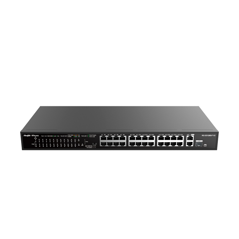 Reyee Switch PoE da Tavolo. 24 Porte RJ45 + 1 Uplink RJ45 + 1 SFP Combo 24 Porte 10/100Mbps + 2 Porte 10/100/1000Mbp, 24 Porte PoE+ 802.3af/at. Potenza totale 370W. Isolamento porte. Controllo del flusso. Plug and Play. Alimentazione: 100V a 240V AC. Dimensioni: 440 x 208 x 44 mm.