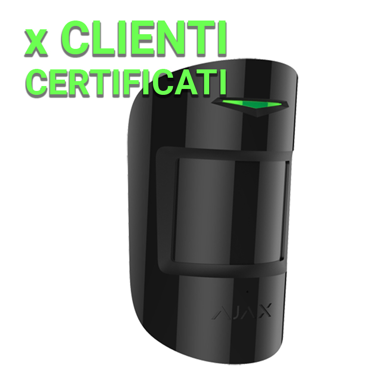 Rilevatore PIR e rottura vetro – Ajax Superior. Supporto con vite di fissaggio. 1 batteria Panasonic CR123A 3,0 V (durata circa 5 anni). Certificato di grado 2. Jeweller wireless 868 MHz. Portata di rilevamento PIR 12 m. Campo di rilevamento rottura vetro 9 m. Dimensioni (senza supporto) 110 (H) x 65 (L) x 50 (P) mm. Colore nero.