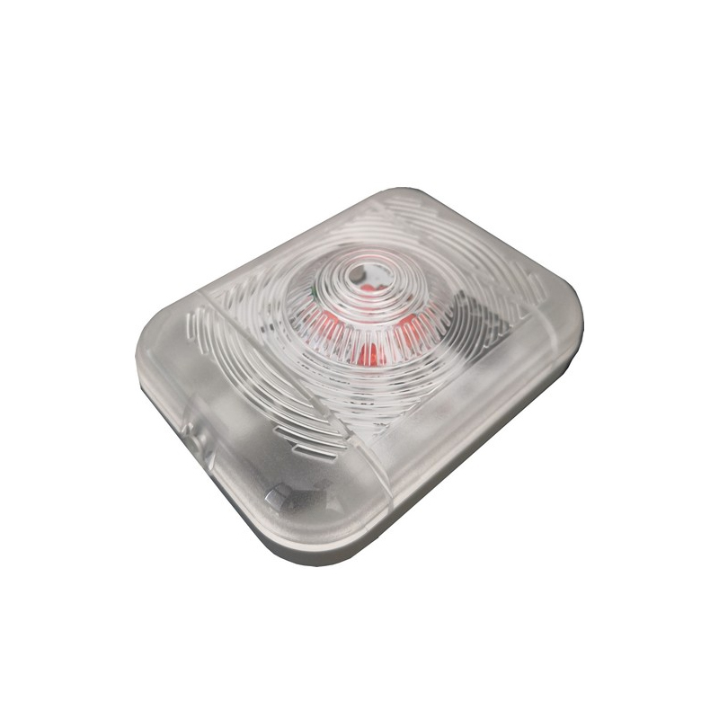 Ripetitore di stato ottico. Alimentazione 12Vdc, basso consumo. Possibilità attivazione con luce fissa o lampeggiante. N° 04 LED alta luminosità. Colore led ROSSI. Coperchio con cupola POLICARBONATO, base ABS, Gradi di protezione IP54. Dimensioni 57,5 x 76,5 x 25mm