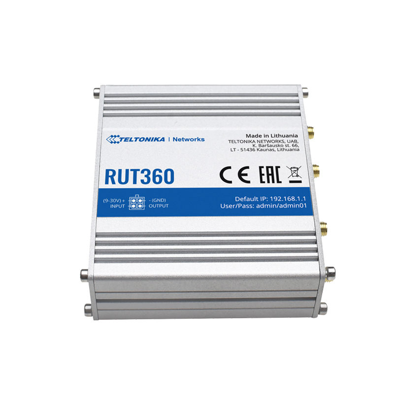 Router Teltonika 4G Industriale, 2 porte Ethernet RJ45 Fast Ethernet, 4G (LTE) Cat 6 fino a 300Mbps, 2x Ingressi + 2x Uscite Digitali, Wi-Fi 802.11b/g/n 2.4GHz. Alloggiamento in Alluminio. Alimentazione: connettore DC 4 Pin industriali 9~30V, alimentatore incluso. Dimensioni: 30 (H) x 100 (L) × 85 (P) mm.