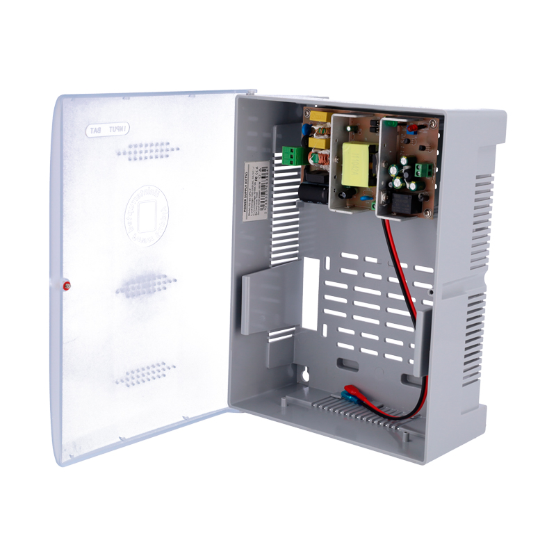 Scatola di distribuzione di alimentazione, 1 ingresso AC 100-240 V 50/60 Hz. Tensione in uscita DC 12V 5A. Protezioni multiple. Funzione UPS con batteria esterna da 17 AH. Custodia di protezione in plastica. Dimensioni: 282 X 220 X 109 mm.