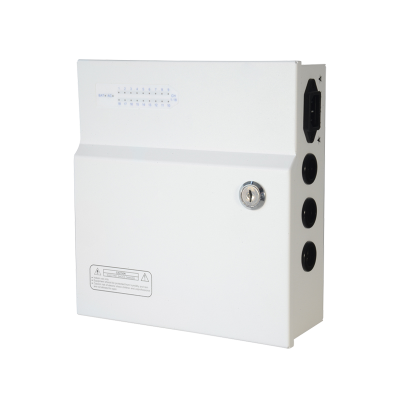 Scatola di distribuzione di alimentazione 1 ingresso AC 110 V ~ 220 V, 18 uscite con doppino rame. Protezione da fusibile PTC riarmabile. Voltaggio d’uscita 12 V / 250 W. Funzione UPS (SAI). Dimensioni 216.5 (H) x 202 (L) x 73 (P) mm.