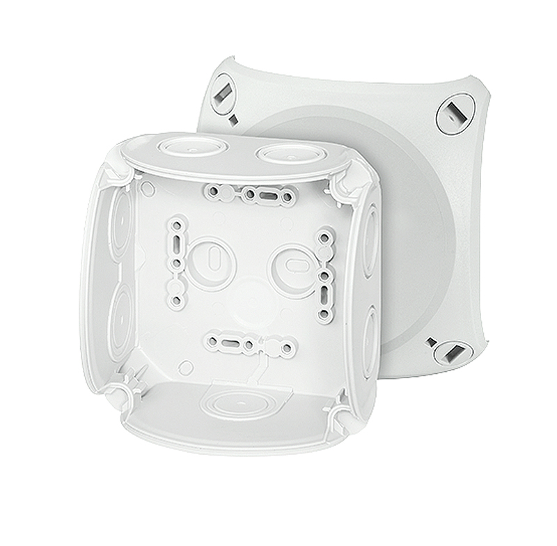 Box di giunzione in polipropilene, RAL 7035 (GRIGIO MOLTO CHIARO). Con MEMBRANE PASSACAVO. Grado di protezione IP66. Sistema che permette di verificare la chiusura del box visivamente. Dimensioni LxHxP 104x104x70 mm.