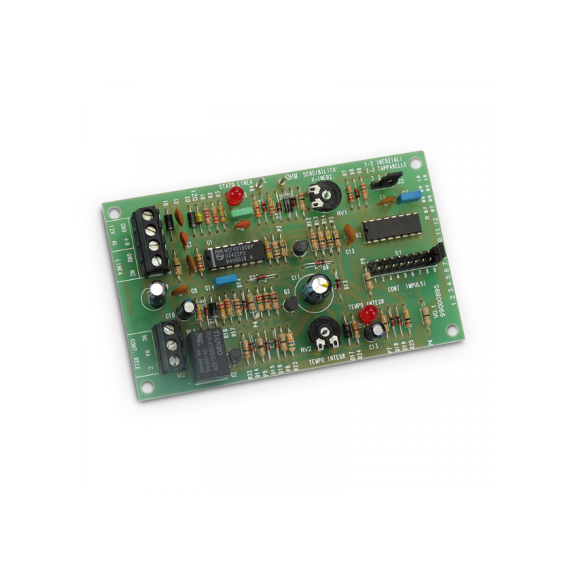 Scheda circuito analizzatore con integraz. digitale. Circuito analizzatore utilizzato per interfacciare sensori inerziali o per tapparelle a centrali antintrusione, elaborando gli impulsi provenienti da questi sensori integrandoli digitalmente nel tempo.