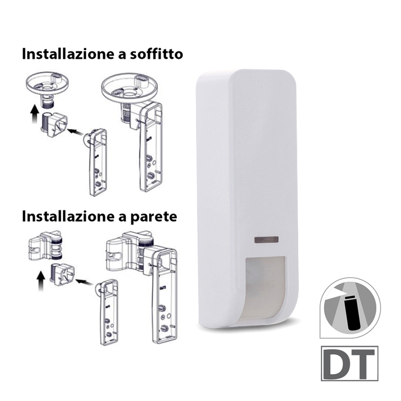 Sensore a Tenda da Esterno cablato DT AM. Tecnologia DT e angolo di rilevazione molto stretto per minimizzare i falsi allarmi. Copertura di rilevazione flessibile e regolabile con 4 differenti livelli di sensibilità. Anti Mascheramento ad Infrarosso Attivo. Altezza di installazione fino a 3m. Snodo a 90° per un’installazione semplificata sulla sinistra o sulla destra dell’area da proteggere. Bus RISCO per diagnostica e controllo da remoto oltre ad installazione e manutenzione semplificata. Copertura: Fino a 12m, 5°. Altezza di Installazione:1.8 – 3.0 m. Tamper: a parete. Assorbimento (modo Relè): 15 mA. Assorbimento (modo Bus): 10 mA. Immunità alla luce solare diretta. Immunità RF: 10MHz a 3GHz, conforme a EN50130-4. Temperatura di Esercizio: da -20°C a 60°C. Grado di Protezione: IP 65. Dimensioni: 124 x 35 x 42 mm – 124 x 44 x 49 mm con staffa. Versione supportata da LightSYS v. 5.92, ProSYS Plus da Firmware v. 1.3. Snodo da soffitto e da parete 180° RA107S000000A per sensori a tenda da esterno INCLUSO.
