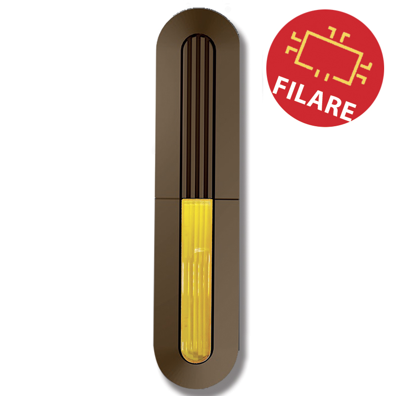 Sirena filare universale EGO colore RUGGINE con gemma GIALLA. Materiale composto da un mix ABS/Policarbonato, tripla verniciatura. Autoalimentata, suono programmabile, segnalazione ottica di inserimento/disinserimento e lampeggio permanente di inserito,programmabili. Controllo del livello di tensione di alimentazione, dello stato della batteria tampone, dell’ altoparlante, delle linee tamper, dei finali audio tramite led a bordo e uscita open collector. Possibilità di montaggio orizzontale o verticale. Pressione sonora a 3 metri 105 dB. Tensione di alimentazione 12Vcc (10,5-14Vcc). Batterie alloggiabili: 12Vcc 2,3 Ah, 12Vcc 2,9 Ah. Assorbimento a riposo 16 mA. Assorbimento suono 1,5 A. Grado di protezione IP44. Protezione antischiuma con doppio modulo ottico EGO-AS integrato, non genera allarme in caso di passaggio di insetti. Temperatura di lavoro -25…+55°C. Dimensioni LxHxP 120x530x85 mm. Peso (batteria esclusa): 2,2 Kg