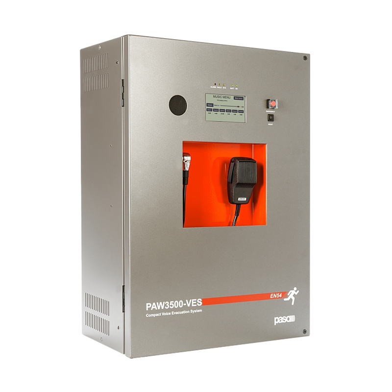 Sistema integrato di evacuazione vocale da parete, 2 amplificatori da 250 W per un totale utilizzabile di 500 W, 2 zone, microfono emergenza, 2 messaggi, certificato EN 54-16 e EN 54-4