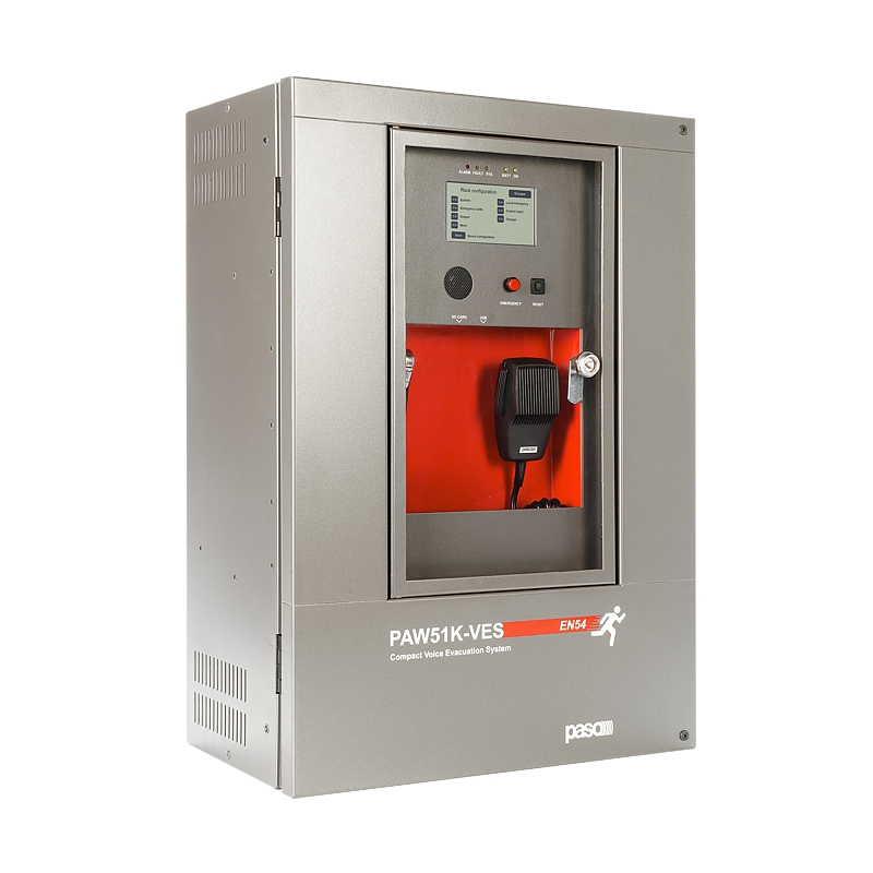 Sistema integrato di evacuazione vocale da parete, 4 amplificatori da 250 W per un totale utilizzabile di 1000 W, 4 zone, microfono emergenza, lettore USB/SD card, 8 messaggi