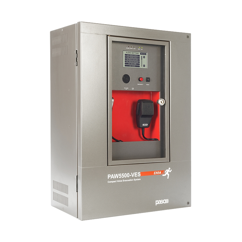 Sistema integrato di evacuazione vocale da parete, 6 amplificatori da 250 W per un totale utilizzabile di 500 W, 6 zone, microfono emergenza, lettore USB/SD card, 8 messaggi, certificato EN 54-16 e EN 54-4