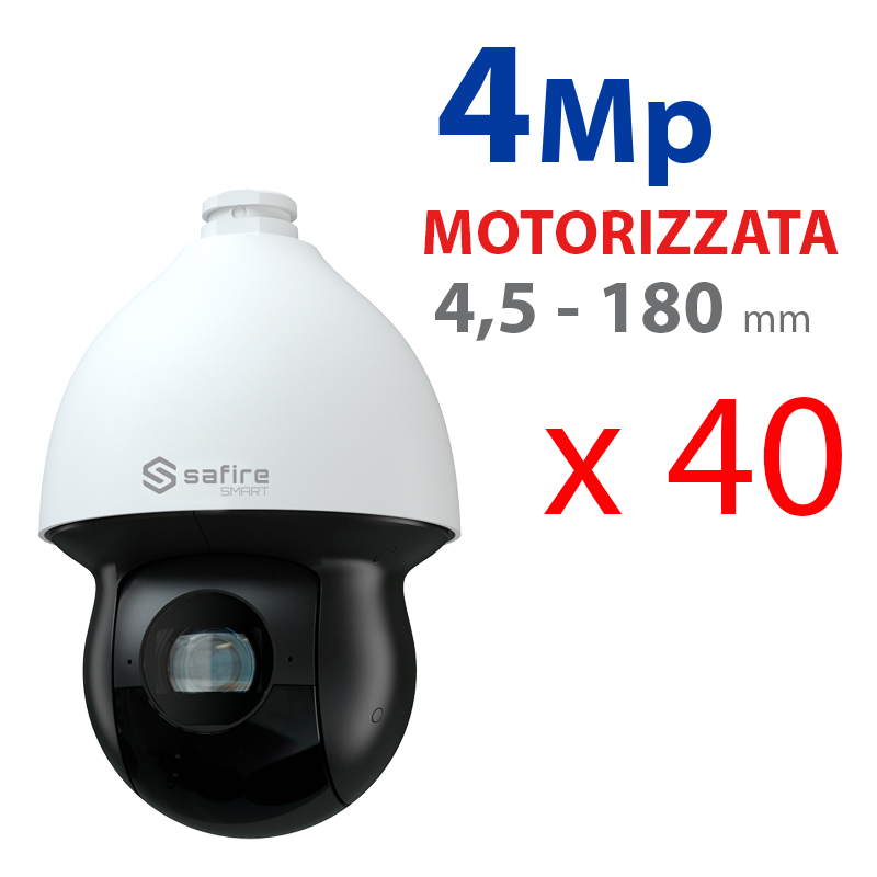 Telecamera Speed Dome SAFIRE SMART PTZ IP gamma I1 Intelligenza Artificiale. Risoluzione 4 Mp (2560×1440). Zoom ottico 40x, Ottica 4.5-180 mm, IR 350m. Autotracking, persona e veicolo. Allarmi. Waterproof IP67 & IK10, PoE+ (IEEE802.3at). Intelligenza Artificiale basata sulla classificazione di persone e veicoli su: Intrusione in area, Attraversamento linea, area di ingresso, area di uscita. Riconoscimento facciale con acquisizione fino a 17 volti contemporaneamente. Smart tracking dopo il rilevamento del volto. Velocità manuale: Orizzontale: 0.1° ~ 390° /s, Verticale: 0.1° ~270° /s. Velocità tra Preset Orizzontale: 420° /s, Verticale: 300° /s. Alimentazione: DC 24 V / 3A, PoE+ IEEE802.3at. Dimensioni (senza staffa): 197 (H) x 302(Ø) mm. Compatibile con: SF-POLEJBOX-0312 staffa da palo; SF-WALLBRACKET-0808, SF-WALLJBOX-0311 staffa da parete; SF-CORNERJBOX-0313 staffa angolare; SF-CBRACKET-0807, SF-CBRACKET-0701E staffa da soffitto; SF-KB23-NT tastiera.