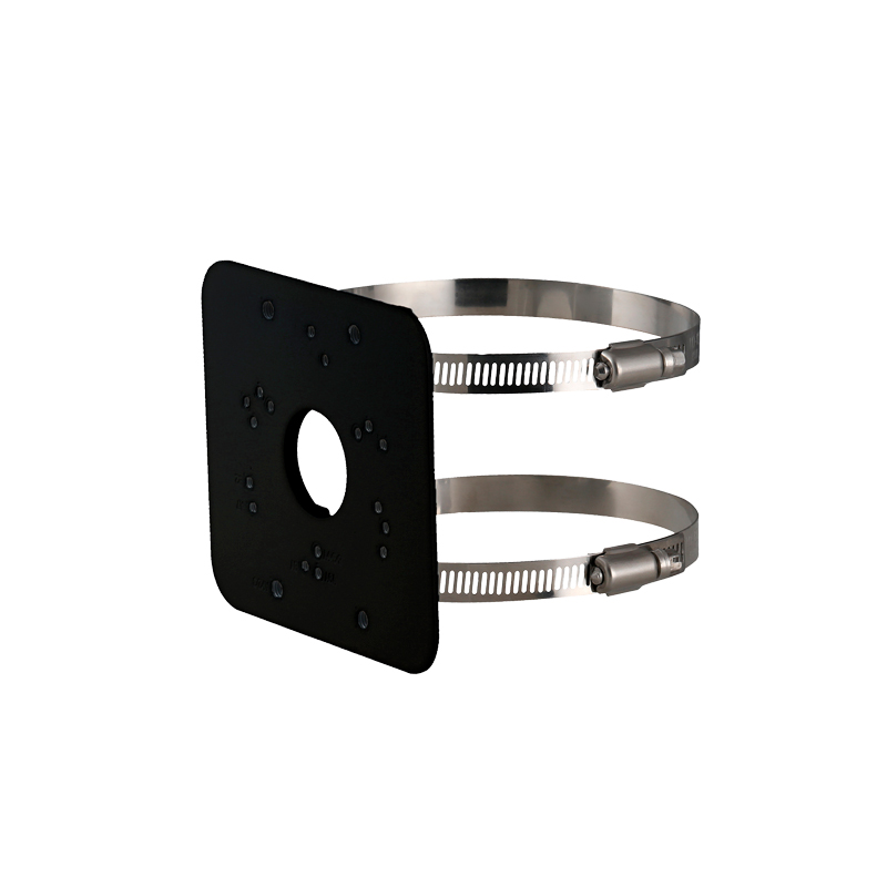 Staffa per pali/lampioni, per telecamere bullet o dome. Range diametro 80~150 mm, adatto per esterni. Colore nero. Corpo in alluminio: Dimensioni: 114 mm (H) x 125,6 (L) x 20 (P) mm.