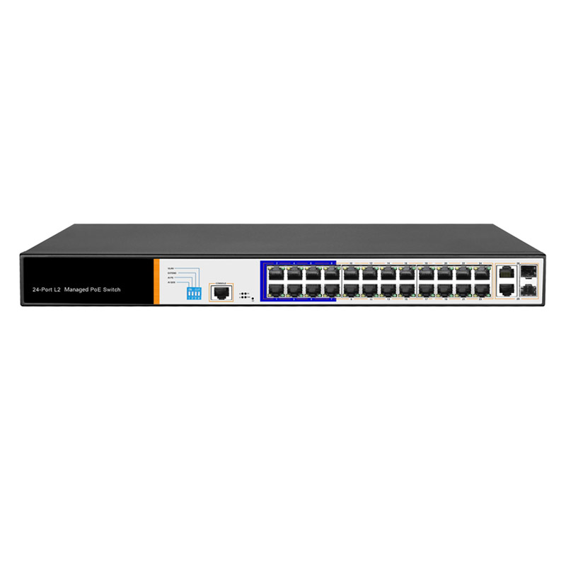 Switch 24 PORTE POE Managed 100 Mbps + 2 porte combo Gigabit, 1 porta console. 5 modalità di lavoro: commutazione standard, AI VLAN, AI Extend, AI PoE, modalità AI QoS. Supporto HI PoE, IEEE802.3af / at, Max.46W potenza uscita singola porta. Potenza totale: 300 W. 26 LED Link / Act24 LED POE 1 LED di sistema 1 LED di alimentazione. Porte di comunicazione protette da scariche elettriche 6KV. Dimensioni LxHxP 440 × 180 × 44 mm.